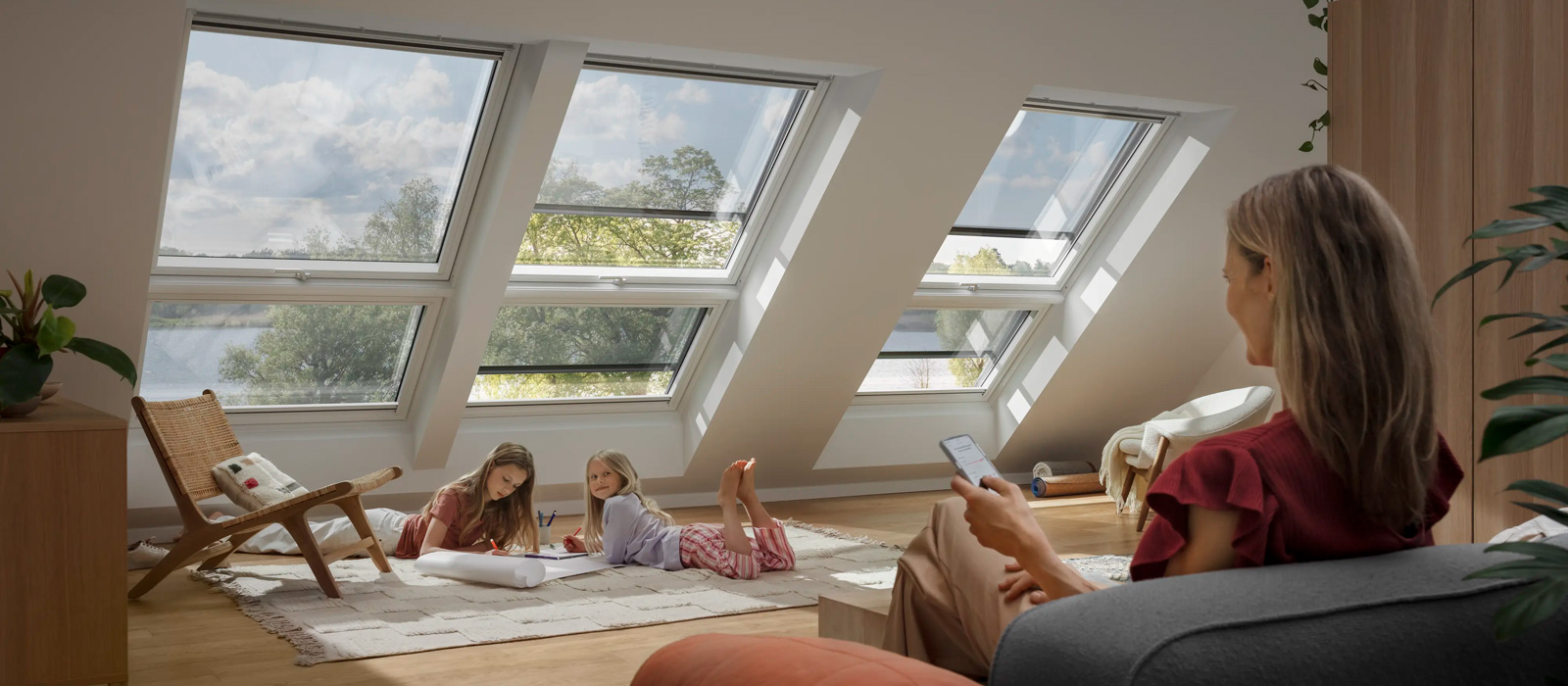 Våra VELUX takfönster finns i både manuella och fjärrstyrda varianter. Med en diskret fjärrkontroll öppnar och stänger du fönstret var som helst i boendet, enkelt och smidigt.